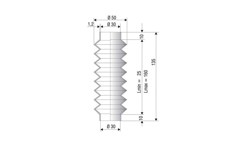 AAG Rubber Bellows NBR Ø30 – Ø30 mm, made of solid nitrile rubber. Color: black. Dimensions: NBR Ø30 – Ø30 mm. Used for moving machine parts where effective protection of both people and machinery is essential. The bellows protect against physical contact and prevent particles and foreign objects from entering mechanical components.
