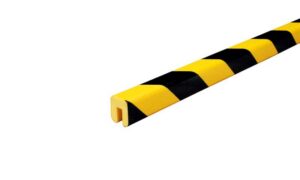 Type G protective strip made of polyurethane (PUR), featuring a core of PU foam and a wear layer of solid polyurethane, which is an extremely durable material. Edge profile dimensions: 30×25 mm. Yellow and black striped with adhesive. Hole width: 8 mm; depth: 19 mm. Complies with DIN 4102 B2 and UL 94 HB/10 mm standards.